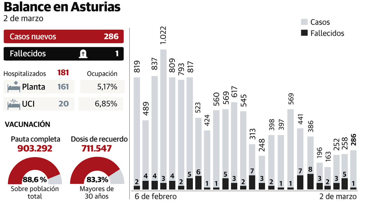 Entre 200 y 300 contagios diarios. Una letalidad que oscila de uno a ocho fallecidos por jornada. Y una ocupación hospitalaria en descenso, con 181 pacientes de covid ingresados actualmente. Esta es la situación epidemiológica de la que parte Asturias para «ir haciendo una transición» hacia la normalidad previa al coronavirus. Un cambio de ciclo en el que se mantiene el uso de la mascarilla en interiores y la obligación de instalar medidores de CO2 en hostelería o gimnasios. Pero deja de limitarse el aforo de los eventos deportivos multitudinarios y ya no estará prohibido fumar en las terrazas; eso sí, quien fume deberá guardar una distancia interpersonal de dos metros.