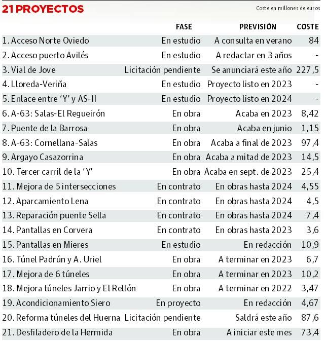 A la legislatura estatal le queda este año y el que viene, tiempo donde el objetivo prioritario será inaugurar la variante de Pajares, los tramos de la autovía del suroccidente (A-63) y el tercer carril de la 'Y'. Hay además once contratos a punto de adjudicar o licitar con una inversión por encima de los 540,4 millones. En fase de estudio y para otro mandato quedan ocho asuntos capitales de más de 364 millones. Y todo tiene su calendario.