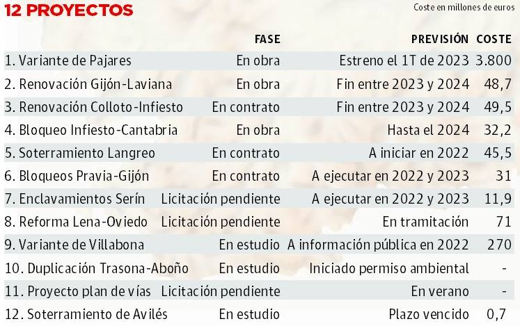 Los plazos en la variante van justos para una puesta de largo antes de las autonómicas de mayo, pero por ahora técnicos y directivos confían en cumplir. Para el resto del año y antes de que expire la legislatura nacional, a más tardar diciembre de 2023, quedaría estrenar el tercer carril de la 'Y' (su plazo oficial es septiembre) y Cornellana-Salas. Las obras de puesta a punto de parte de la red de Feve deberían estar para entonces viviendo su recta final.