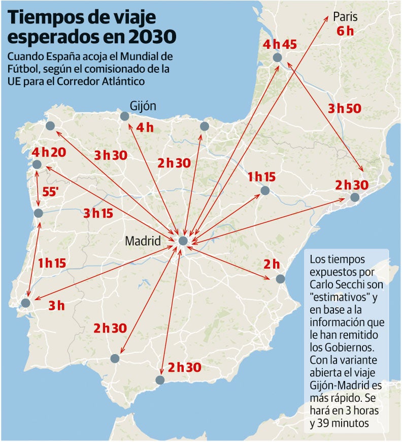 José Antonio Sebastián, el comisionado del Corredor Atlántico, hizo una presentación apurado por el tiempo en la que incluyó la adaptación del tramo León-La Robla y la duplicación de Valladolid-León como los proyectos de mayor interés para la región. Su homólogo en la Comisión Europea, Carlo Secchi, quiso inspirar al auditorio invitándoles a pensar en cómo será la red prioritaria en 2030, durante el Mundial de fútbol de España, Portugal y Marruecos. El mapa que confeccionó estima un tiempo de viaje Madrid-Gijón de cuatro horas, el segundo mayor para la periferia peninsular. Cierto que la apertura de la variante ya dejará ese trayecto en tres horas y 39 minutos, pero también que, de la presentación que Secchi hizo en base a la información que le pasan los gobiernos, se observa que Bruselas no cuenta con mejoras adicionales de tiempo.