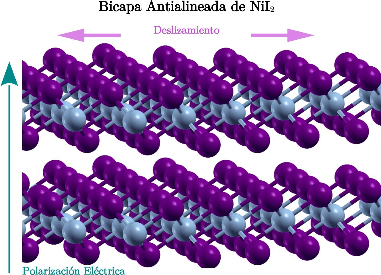 Es el caso concreto del NiI2, o niquelato de yodo, es un material de van der Waals magnético, que retiene ese carácter magnético incluso al reducirlo a una sola monocapa. Los investigadores de la Universidad de Oviedo han demostrado que, si se invierte la orientación relativa de una bicapa de este material girando una de las capas 180º, el material se vuelve ferroeléctrico.