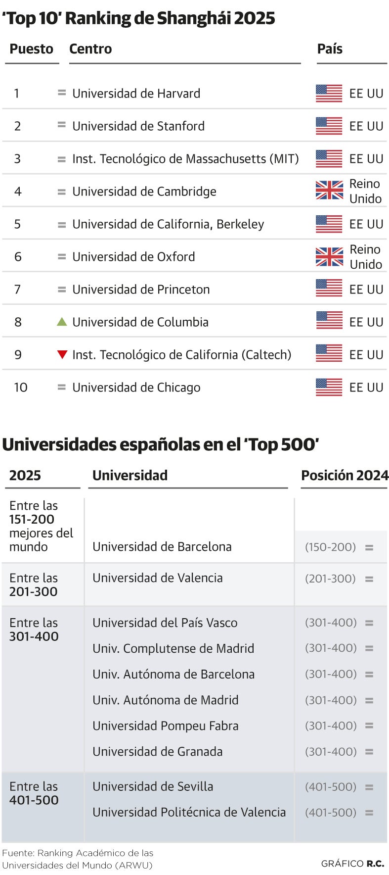 La élite española, según el 'ranking de Shanghái', queda limitada este curso a diez centros, los mismos de 2024. La Universidad de Barcelona se mantiene en la franja 150-200 y la Universidad de Valencia es la única que se cuela entre las 201-300 mejores (desde el puesto 99 solo se numeran por centenas). El tramo del 301 al 400 es el más concurrido. Allí están la Complutense y la Autónoma de Madrid, la Autónoma de Barcelona, la Pompeu Fabra, la de Granada y la del País Vasco, que se consolida en este escalón. En el último centenar de la clasificación principal (401-500) están la Politécnica de Valencia y la Universidad de Sevilla.