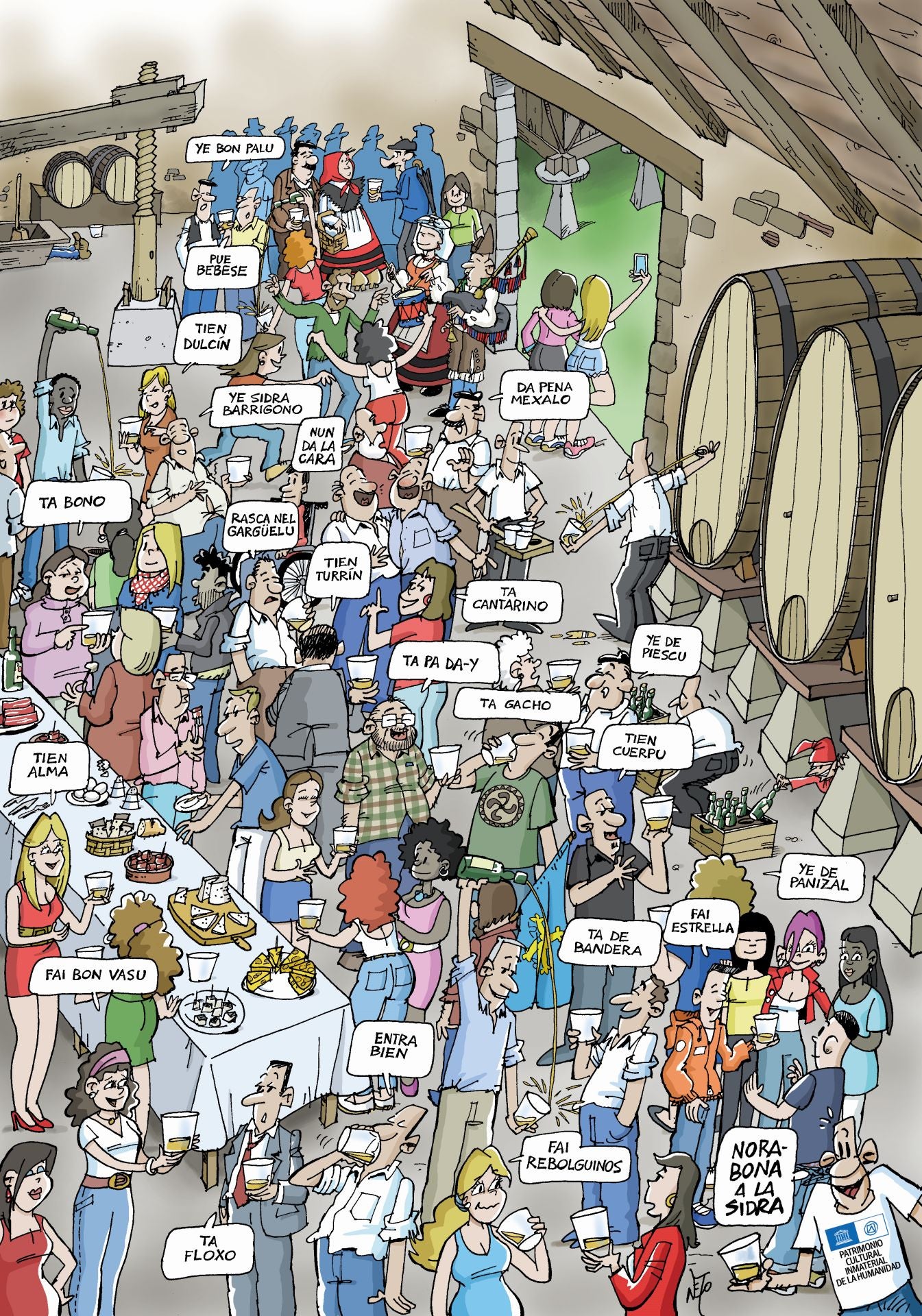 A lo largo del tiempo la cultura sidrera asturiana ha ido generando un vocabulario propio y específico de enorme riqueza que abarca todas las fases del ciclo seguido por nuestra bebida autóctona: del cultivo y recogida de la manzana a la elaboración del producto, su comercialización y consumo. De dominio usual entre los profesionales y agentes del sector, el significado de este léxico en el conjunto de la población va la par de los conocimientos en la materia de cada persona o como se dice en ese mismo lenguaje, de lo «entendía» que sea en cuestión de sidra. Al lado de los términos técnicos o valorativos aplicados en cada fase del producto, existe igualmente una serie de frases hechas, todo lo amplia que lo determina el ingenio de los hablantes, referidas por regla general al estado o calidad de la bebida que se sirve en los establecimientos. Les ofrecemos una muestra básica de ese vocabulario de utilidad indudable para poder apreciar la sidra con conocimiento de causa y en la misma lengua de la cultura inmaterial que la UNESCO acaba de reconocer.
