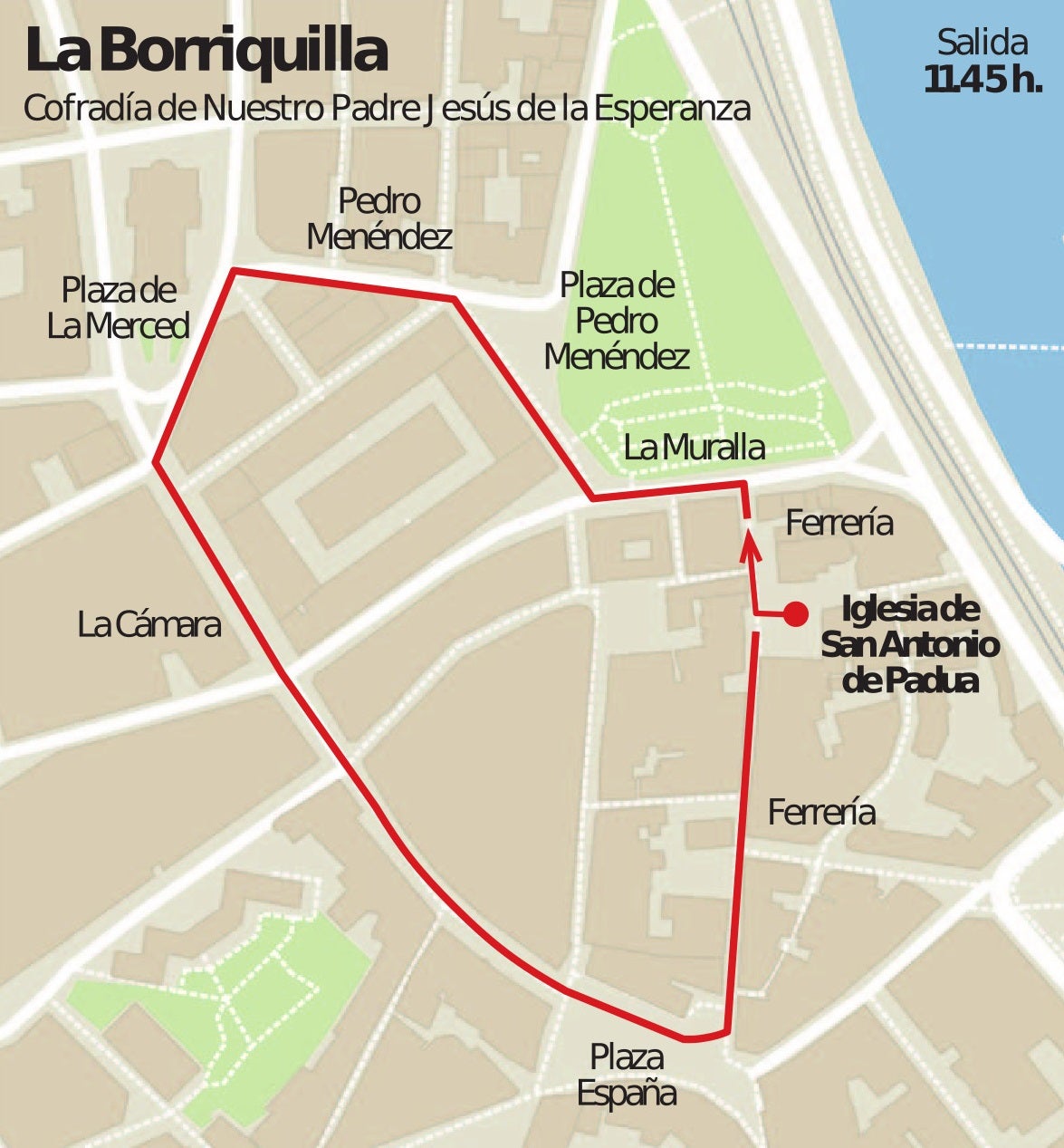 A las 11.45 horas, en la iglesia de San Antonio de Padua, en la plaza de Carlos Lobo, la Cofradía de Nuestro Padre Jesús de la Esperanza comenzará un recorrido que le llevará por las calles de La Ferrería, la Muralla, plaza y calle de Pedro Menéndez, plaza de La Merced, calle de La Cámara, plaza de España y de nuevo por la Ferrería se regresará al templo donde se celebrará la misa con Lectura de la Pasión del Señor. En esta procesión se representa la entrada de Jesucristo triunfante en Jerusalén y su popular nombre viene de que lo hace a lomos de una borriquilla.