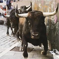 Tiene tres patas en el aire, los pechos anchos como un tanque y los pitones apuntando al cielo como dos espadas. Le siguen tres hermanos en una imponente manada. El toro arranca como una locomotora después de caer en la Curva entre Mercaderes y Estafeta y es la imagen misma del miedo. Esa fotografía imposible es la encargada de anunciar la Feria del Toro de Pamplona 2016, el ciclo de toros y toreros cuya imagen ha presentado hoy la Casa de Misericordia, que es la que organiza la feria, pero también el encierro.