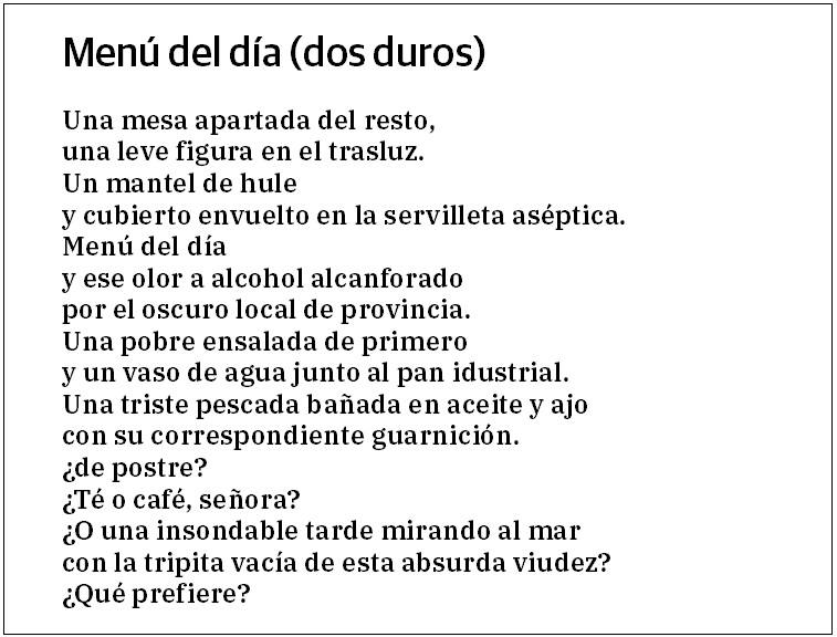 Hubo tiempo durante la cita para perderse por la desgarradora verdad de sus letras, como al poco de comenzar, cuando puso su voz al poema 'Éramos tan felices y no lo sabíamos', que le dedicó a Sepúlveda y que se publicó en este periódico al día siguiente de su partida. También miró Carmen a su presente y leyó varios poemas inéditos, como el que se reproduce junto a estas líneas, 'Menú del día (dos duros)': «En este hablo de mi presente, de lo que me está sucediendo», se sinceraba.