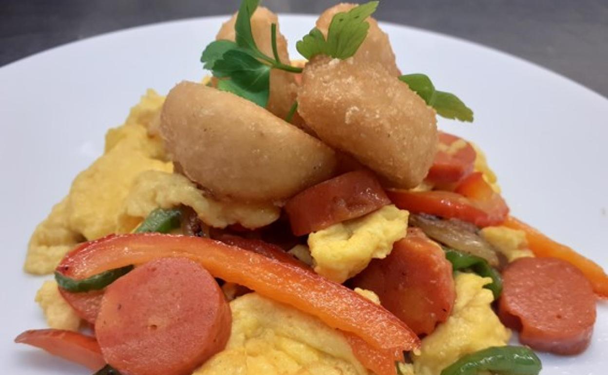 El revuelto de chistorra marina y patatas de merluza consiste en una innovadora propuesta de I+D gastronómico diseñada por Ángel León junto a Compass Group España y Pescanova para promover una alimentación más equilibrada basada en el aumento del consumo de pescado.