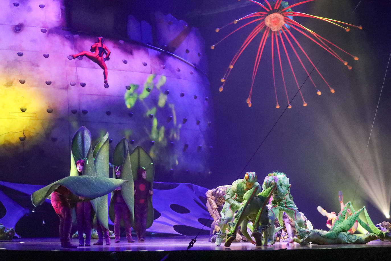 Las delicadas hormigas rojas abren esa ruta escalando los palos chinos. David Ayottte, Charlotte Fallu, Raphaël Filiatreault, Yann Masia, Théo Legros-Lefeuvre, Miliève Modin-Brisebois son quienes protagonizan este vertiginoso número sobre unas barras verticales. Un arranque que epata. Dan paso a la libélula que juega a hacer equilibrios desde la elegancia y la fuerza de las manos que sostienen y permiten el hermoso devenir de Sherheii Ivanov. Unas telas nos ayudan a descubrir el nacimiento de una mariposa de la mano de Svetlana Delous. De nuevo en las alturas, la araña negra a la que da vida Domenic Taylor juega a los equilibrios y vuelos sobre un aro. Sale después a escena la criatura que baila y se contorsiona cual si fuera un gusano tras la que se oculta Sergey Rysenko, uno de los artistas ucranianos en esta multicultural familia con presencia de 25 nacionalidades distintas. Los escarabajos se aupan a lo más alto en el espectacular número que pone fin a la primera parte del show. Se trata de una disciplina rusa que hace volar literalmente a seis metros de distancia entre ellos a un grupo de acróbatas que incluyen a Nansy Damianova, Camille Santerre-Gervais, Nina Kartseva, Olga Shcherbatykh, Inna Rudenko, Marie-Élaine Mongeau, Denys Dyky, Alexander Grol, Tamas Fuleman, Dmytro Rybkin, Nikolay Karyachkin y Gianfranco Di Sanzo. Hubo un pequeño susto, una caída a red que se solventó rápidamente y el espectáculo continuó impresionante e impresionando.