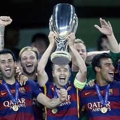Jugadores del Barcelona celebran con el trofeo de la Supercopa.