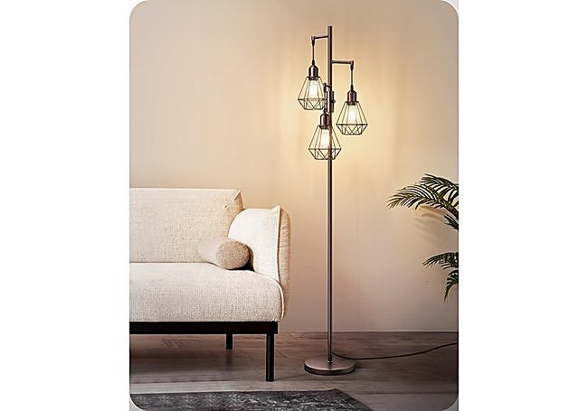 Con un diseño retro industrial, esta lámpara de pie EDISHINE integra tres pantallas metálicas tipo jaula y una base ponderada que aporta estabilidad. Permite regular la intensidad de la luz de forma continua mediante un mando giratorio. Incluye tres bombillas LED E27 de 3000K, ofreciendo una iluminación cálida y eficiente para cualquier estancia.