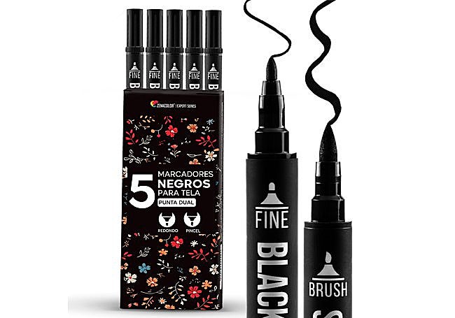 Con un formato compacto y cinco rotuladores textiles negros de doble punta, este set de Zenacolor facilita la personalización de prendas y accesorios. La tinta negra resalta sobre tejidos claros, permitiendo crear desde detalles precisos hasta trazos más marcados en camisetas, bolsos o gorras.
