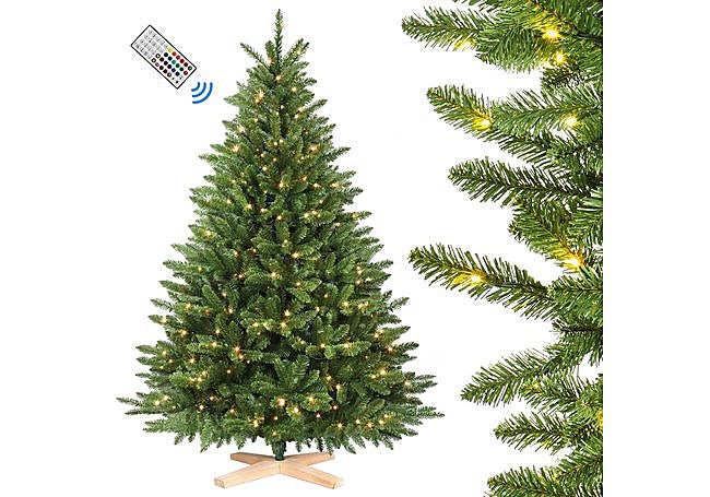 Presenta un diseño voluminoso con 1381 ramas de PVC y una base de madera cruzada que aporta estabilidad. Las 400 luces RGB integradas, controladas por mando a distancia, permiten personalizar la iluminación con ocho efectos distintos. El sistema de montaje por secciones facilita la instalación, logrando un árbol de Navidad artificial de 210 cm con presencia y ambiente festivo.