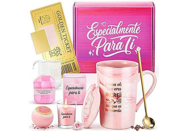Este set de regalo incluye una taza de cerámica rosa de 340 ml, una vela aromática de rosa, una bomba de baño, un jabón artesanal, un diseño decorativo y una tarjeta dorada para rascar. La taza mantiene las bebidas calientes, la vela ofrece un aroma relajante y la bomba de baño brinda una experiencia de autocuidado.