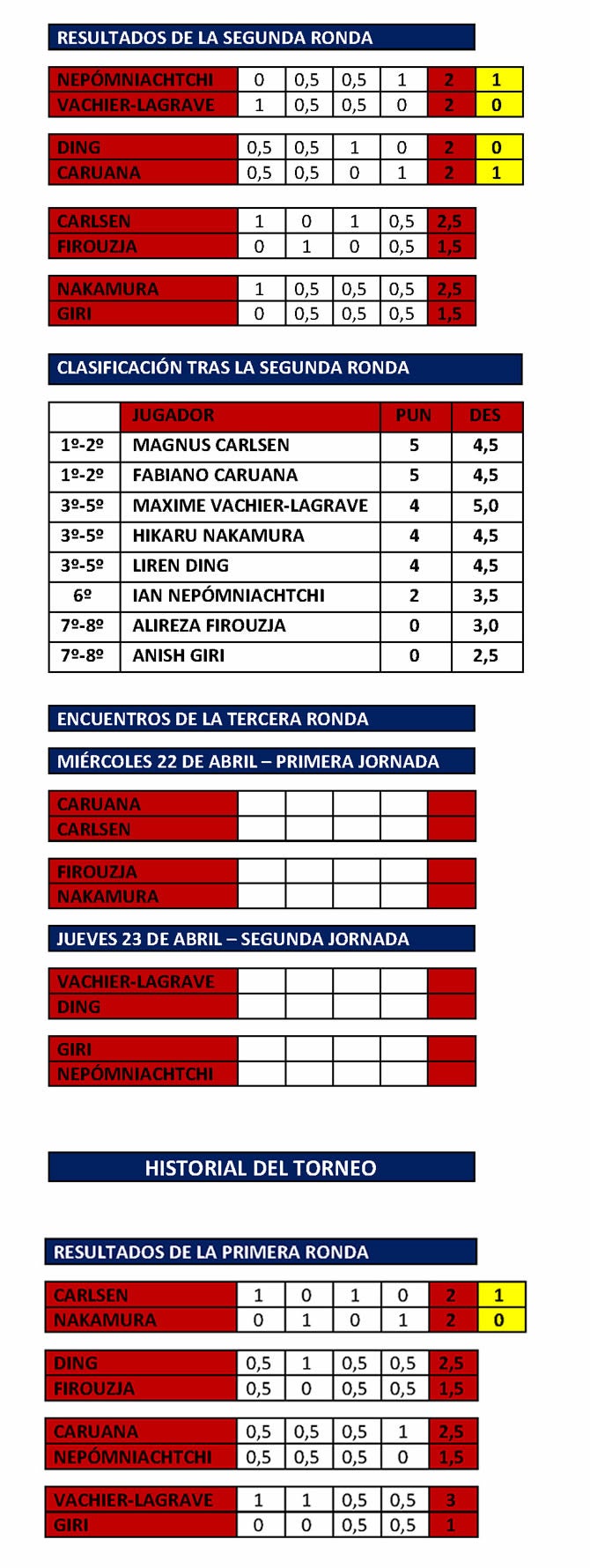 Tanto Nepómniachtchi como Caruana ganaron sus encuentros, pero suman dos puntos y no los tres que se disputan. Si en las cuatro partidas se produce empate, el que vence en el Armagedón se lleva dos puntos y el que pierde gana uno. Caruana suma cinco puntos, los mismos que Carlsen, por lo que ambos comparten el primer lugar de la clasificación. Con un punto menos están Vachier-Lagrave, Nakamura y Ding.
