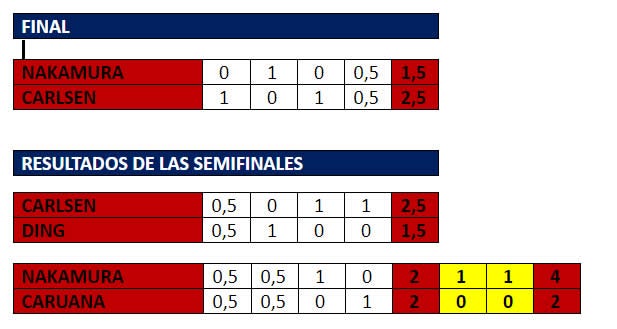 El noruego Magnus Carlsen, que cumplirá treinta años el próximo mes de noviembre, es el actual campeón del mundo en las tres modalidades de tiempo, tanto de ritmo clásico, como rápido y relámpago, mientras que el estadounidense Hikaru Nakamura, que ha cumplido los treinta y dos años, es el número uno del ránking mundial de ajedrez relámpago. Su nombre, en japonés, significa luz, aunque ayer no encontró la necesaria para derrotar al escandinavo.