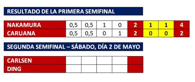 En la primera partida fue Fabiano Caruana quien dirigió las piezas blancas. Optó por otra Apertura Italiana que, en este caso, desembocó en un festival táctico con opciones para ambos ajedrecistas. Al final, ganó Nakamura. Éste disputó la segunda con el primer color y Caruana planteó otra vez la Defensa India de Rey. Se produjeron posiciones muy complejas, con posibilidades para los dos, pero finalizó con otro triunfo de Hikaru Nakamura, quien, de esta manera, ganó su plaza para disputar la final del domingo.