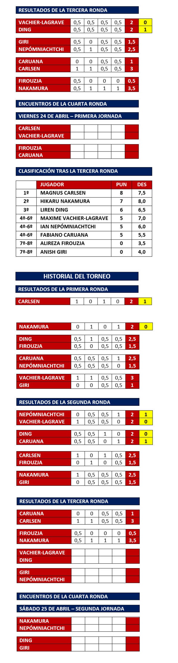 Una vez terminados todos los encuentros de la tercera ronda, Magnus Carlsen lidera la prueba con ocho puntos, segundo es Hikaru Nakamura, con siete puntos, y tercero se coloca Liren Ding, con seis puntos.