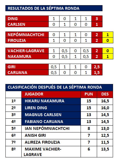 Los cuatro primeros clasificados de la prueba se enfrentarán en sendas semifinales para ganarse los dos puestos que darán derecho a disputar la gran final. Nakamura y Caruana jugarán esta misma tarde, a partir de las cuatro, la primera de ellas, mientras que mañana se enfrentarán Ding y Carlsen, a la misma hora.