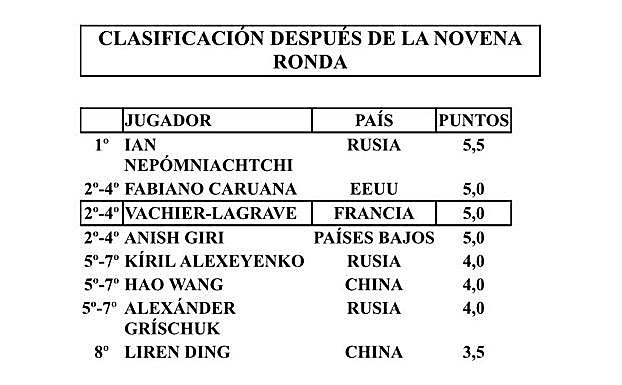 Nepómniachtchi sigue líder, con medio punto más que él, Caruana y Vachier