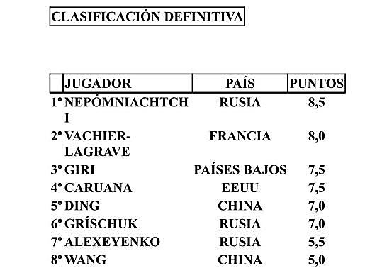 Lenguas anabolenas cuentan que Nepómniachtchi festejó ayer su éxito de convertirse en el pretendiente al título mundial con la contundencia que requería este logro, por lo que la noche se le hizo larga. De todas formas, se sentó y condujo el segundo color frente al pétreo Liren Ding y, sin la presión del resultado y, pienso yo, con la mente ya en otros asuntos, empleó un esquema demasiado alegre que el chino respondió con su solidez tradicional. El ruso se lanzó al ataque, se equivocó en una secuencia táctica y quedó inferior, más tarde cometió otro error y quedó totalmente perdido, por lo que se vio obligado a abandonar poco más tarde. La victoria en esta partida le hubiera supuesto al ruso el ingreso en el selecto club de los ajedrecistas que alcanzaron la elevada barrera de los dos mil ochocientos puntos, lo que sólo han logrado trece jugadores. Tiempo tendrá para este objetivo.