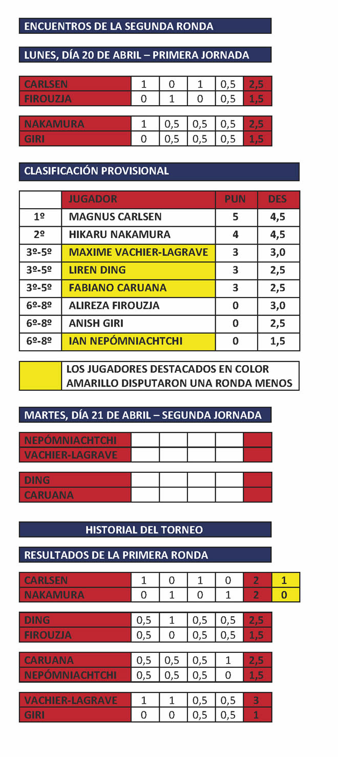 Carlsen se coloca primero y Nakamura es segundo, aunque de forma provisional, pues los otros dos encuentros de esta segunda ronda se disputarán esta tarde, que será cuando se enfrenten Ian Nepómniachtchi y Maxime Vachier-Lagrave, por un lado, y Liren Ding y Fabiano Caruana, por otro.