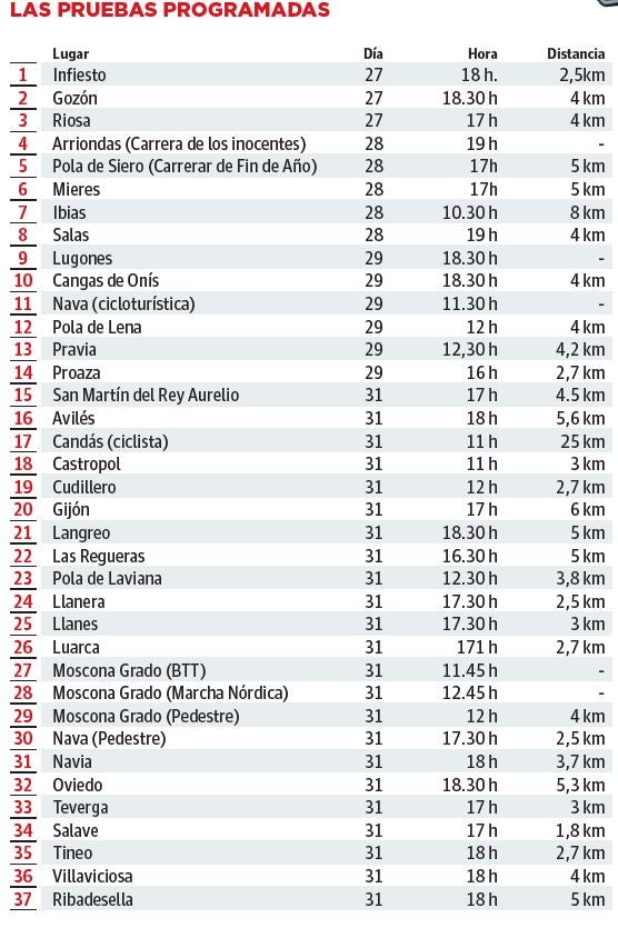 Mieres; Arriondas, con su 'Carrera de los inocentes'; Ibias, con su prueba para andarines; y Salas, completan las opciones. Lugones estrena una 'Carrera de Fin de año', que viene a sustituir a su San Silvestre. Compartirá protagonismo con pruebas tan tradicionales como las de Cangas de Onís, Pola de Lena, Pravia, Proaza y la cicloturista de Nava.