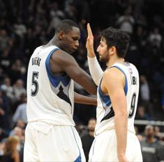 Ricky Rubio celebra una canasta conn Gorgui Dieng.
