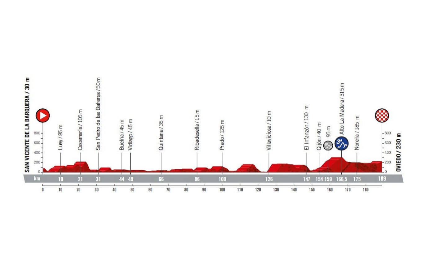 La Vuelta a España ha programado para el segundo fin de semana de agosto tres etapas en Asturias. La primera de ellas será una etapa llana que unirá San Vicente de la Barquera y Oviedo, una etapa de 188 kilómetros con final junto al Teatro Campoamor idónea para los sprinters. En sus primeros pasos por el Principado el pelotón pasará por Ribadesella, Colunga, Villaviciosa y Granda.