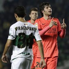 Además, sólo tres minutos después de encajar el segundo, los ilicitanos fueron víctimas de un más que dudoso penalti provocado por Pedro transformado por el extremo al que se le han acabado las oportunidades en los grandes choques, taponado por un tridente extraordinario (Messi-Luis Suárez-Neymar), con el crack argentino por banda derecha siempre que Luis Enrique apueste por el gran resultado que le dio ante el Atlético y no traslada otra vez a la derecha al goleador uruguayo. El trío de ataque ya cumplió en la ida al marcar tres goles, y también en el último partido de Liga frente a los rojiblancos, y se merecía descansar en el Martínez Valero, donde incluso tuvo oportunidad, aunque por poco más de una hora, alguien que no cuenta para el técnico asturiano: Montoya.