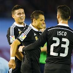 El Real Madrid sigue la estela del líder, el Barcelona, tras doblegar al Celta de Vigo (2-4), en un partido en el que volvió a brillar el delantero mexicano Javier 'Chicharito', quien con un doblete volvió a ser decisivo en el triunfo de su equipo, que resolvió con su pegada una de las salidas más complicadas que le quedaba en este tramo final de campeonato.