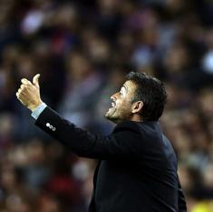 El entrenador del FC Barcelona Luis Enrique da instrucciones a sus jugadores.