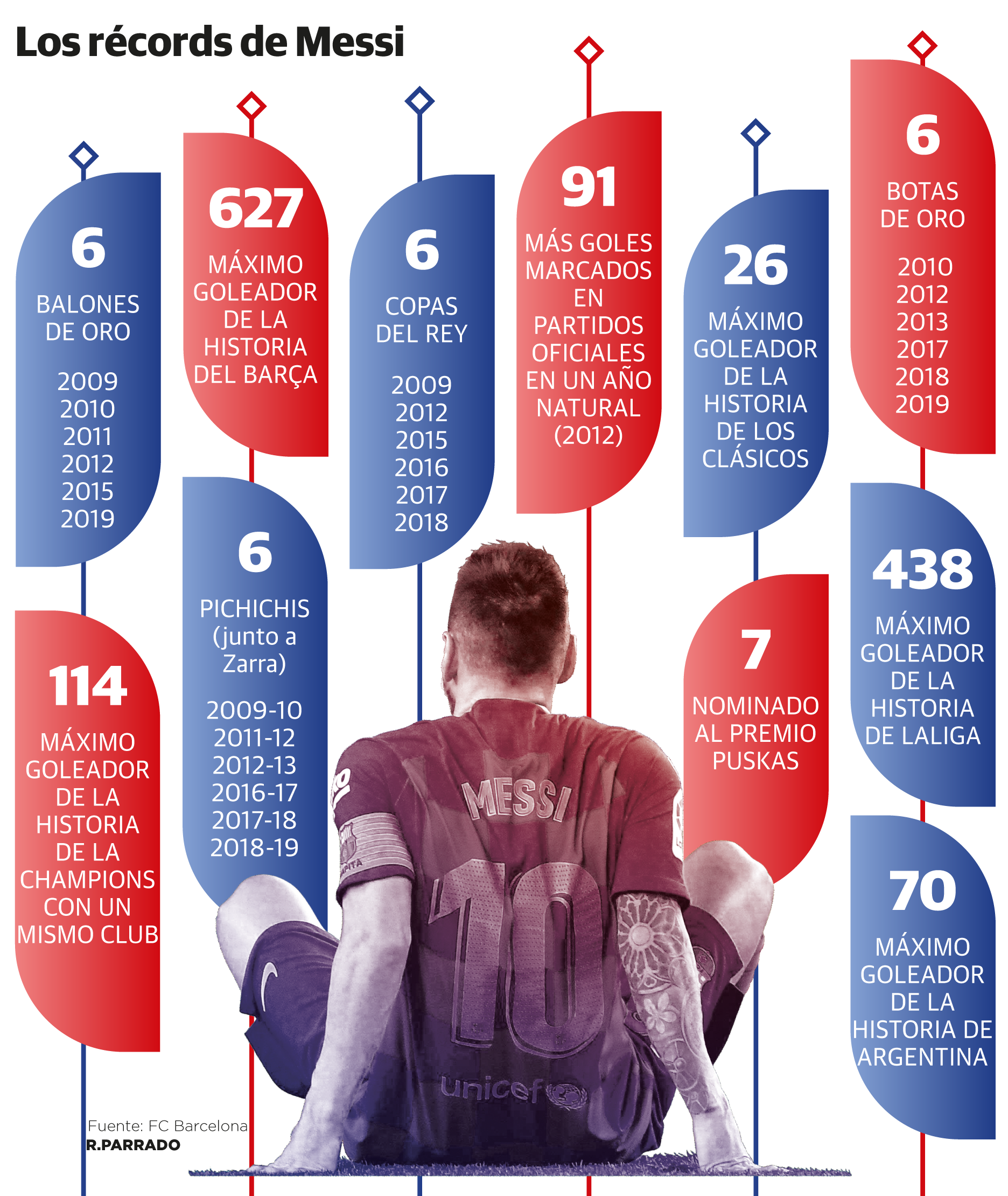 Messi tiene muchas ilusiones depositadas en el cierre de la temporada. Están las aspiraciones colectivas, las confesables, como lograr la undécima Liga de las 16 disputadas (nueve de las últimas doce) o su quinta de Liga de Campeones, un título que le dejaría a una de las seis de Gento. Pero también están las inconfesables, las individuales, objetivos que él sabe que es mejor no manifestar en voz alta para no que no le tilden de egoísta, pero que le motivan y le ayudan a sacar lo mejor de sí mismo para beneficio, también, de su equipo. Y algunos de esos retos son realmente llamativos.