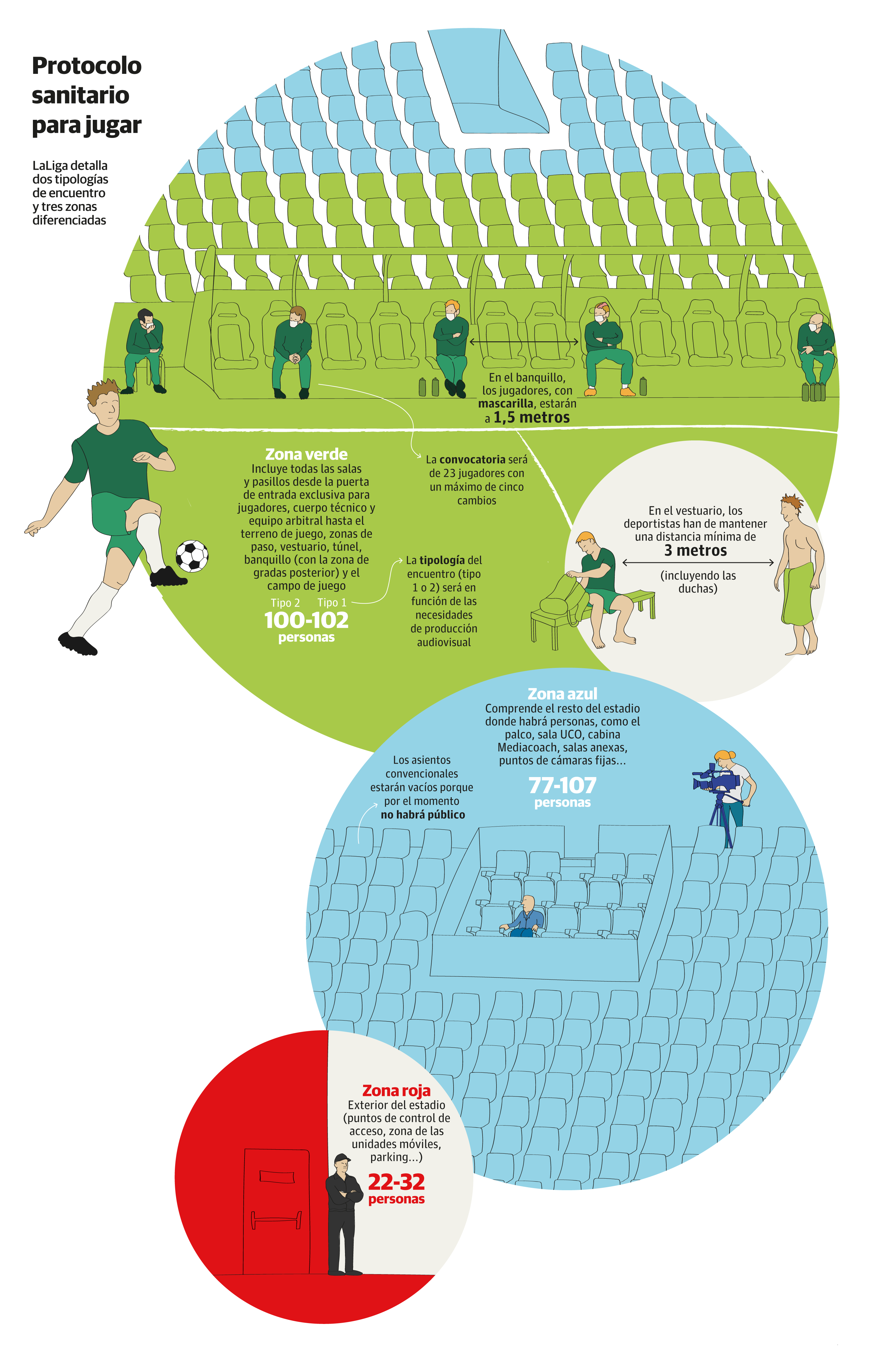 Con un máximo de 241 personas en los estadios, divididos en tres zonas, la verde, desde la puerta exclusiva de entrada para jugadores, cuerpo técnico y equipo arbitral hasta el terreno de juego, representa el 'punto crítico de higiene y de control sanitario', «en el que el nivel de limpieza debe de ser máximo», reclama el protocolo de actuación para la vuelta a la competición para los equipos de la Liga.