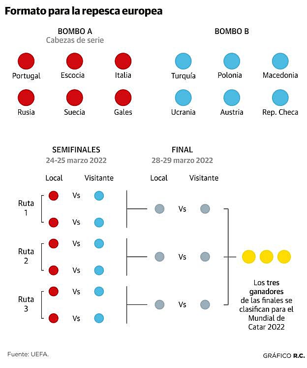 Junto a Italia y Portugal son cabezas de serie en el sorteo que se celebrará el próximo 26 de noviembre la Suecia de los Ibrahimovic e Isak, ante sus última y primera ocasión de disputar un Mundial; la Gales de Bale, ya más jugador de selección que de club en los últimos años; la Escocia de Robertson o McTominay, que no acude a un Mundial desde Francia'98, y Rusia, cuartofinalista en el campeonato que acogió en 2018 y en el que se erigió en el verdugo de España. Estas seis selecciones, las seis segundas de grupo en la primera fase con mejor puntuación, tendrán el privilegio de disputar sus semifinales, entre el 24 y el 25 de marzo de 2022, como locales, jugándose ante su gente la presencia en uno de los tres partidos decisivos, que a su vez se celebrarán entre el 28 y el 29 de marzo del próximo año, cuando se conocerá el cartel definitivo de trece representantes europeos en Catar.
