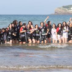 Tras un brindis con la Corporación municipal, y saludo desde el balcón municipal, las jugadoras de hockey no dudaron en meterse en las aguas del Cantábrico