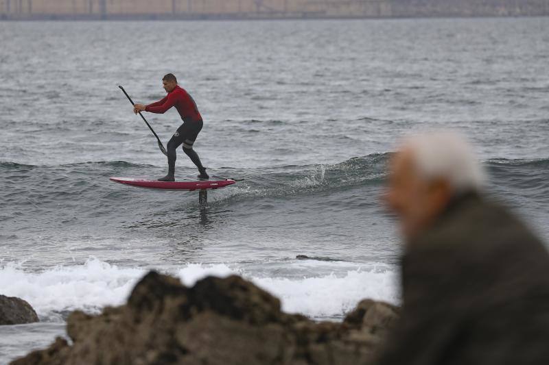 Ahora Ángeles y Fernando están en la cresta de la ola. Al menos en cuanto a repercusión. Porque muchos de los curiosos han pasado en muy poquito tiempo de la sorpresa y estupefacción a admirar las piruetas de los dos. Muchos amigos también se han interesado por esta modalidad. En definitiva, ya no los ven como a los «dos tarados» que surfean extrañamente en la playa de San Lorenzo y que muestran una forma de rebelarse con diversión y entusiasmo a la crudeza de la pandemia.