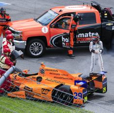 Pero Alonso no contaba con que la Indy da una lección en cada curva. En este caso, la clase magistral de resalidas la tomó por las malas. Scott Dixon, el hombre que había conseguido la pole más rápida en 20 años, salió despedido por los aires en uno de los accidentes más fuertes y espectaculares que se recuerdan, cuando Jay Howard perdió el control de su coche. Dixon se estrelló de lateral contra las vallas, que demostraron que el chasis Dallara es una auténtica caja de seguridad para los corredores: salió inmdemne, ni un rasguño.