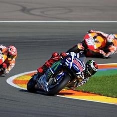 El domingo Jorge Lorenzo (Yamaha) sumó en el circuito "Ricardo Tormo" de Valencia su quinto campeonato mundial y el tercero en la categoría de MotoGP, una carrera en la que los también españoles Marc Márquez (Honda) y Dani Pedrosa (Honda) quedaron segundo y tercero respectivamente en el podio.