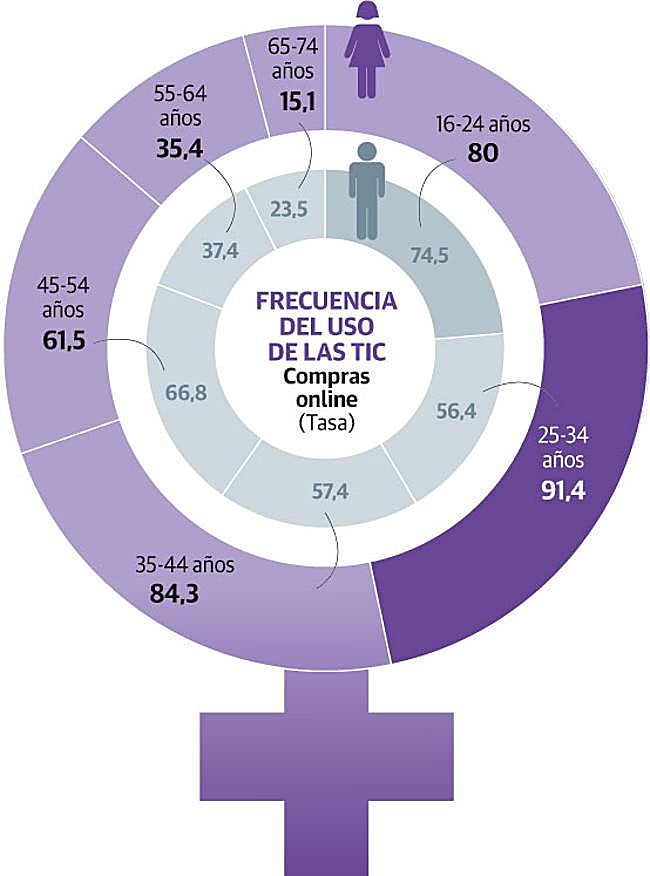 Un giro que se consolida. «En 2021 las mujeres de este grupo de edad, 35 y 44 años, siguen haciendo un uso de las compras 'online' muy alto (84,3%) y mucho mayor que el de los hombres de su edad: 27 puntos más». En el caso de las más jóvenes, de entre 25 y 34 años, el uso fue a más. «Nueve de cada diez mujeres hizo compras por internet frente a solo cinco de cada diez hombres».