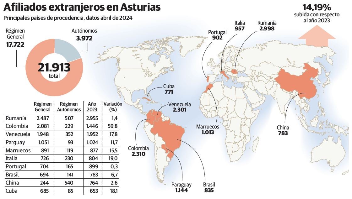 En los últimos años, el número de trabajadores extranjeros en Asturias ha ido en aumento, con un repunte significativo en los ejercicios más recientes. Entre ... abril de 2023 y el mismo mes de este año, 2.721 de los 7.576 afiliados medios totales que se incorporaron al mercado laboral –uno de cada tres– procedían de fuera del país. Esto sitúa a Asturias, con un crecimiento del 14,3%, como la segunda comunidad autónoma con mayor alza, únicamente superada por Galicia, muy por encima de la media nacional –del 8,5% interanual– y lejos del 2% que se incrementó la afiliación total en la región. Los 21.913 extranjeros que hoy trabajan en el Principado ya representan el 5,7% del total de los 381.888 afiliados a la Seguridad Social.