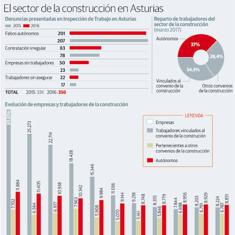 Las denuncias presentadas ante la Dirección Territorial de la Inspección de Trabajo y Seguridad Social del Principado alcanzaron en 2016 la cifra récord de 356. De ellas, 201 se debieron a los llamados 'falsos autónomos', 83 a contrataciones irregulares, 50 a empresas sin trabajadores y 22 a empleados sin asegurar, según los datos de la última memoria de actividades de la Fundación Laboral de la Construcción (FLC).
