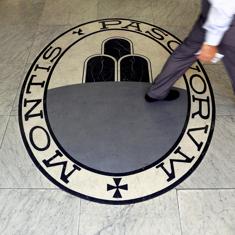 Un hombre camina sobre el logo del Monte dei Paschi en sus oficinas de Roma.