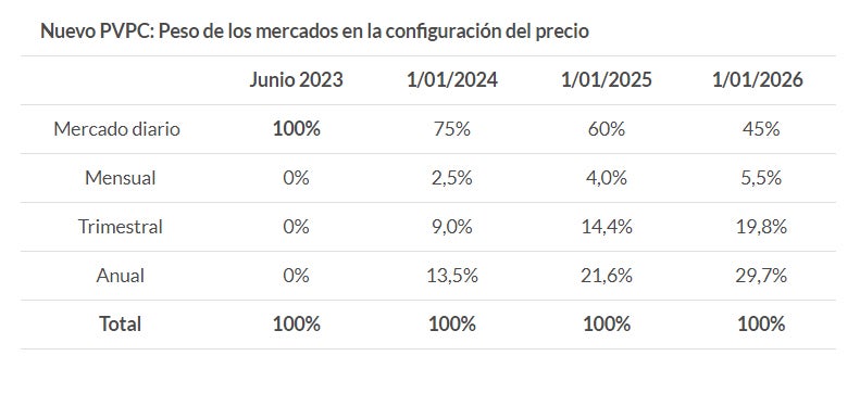 Con esta modificación, el PVPC tendrá en cuenta cuatro cifras: el precio medio diario, el mensual, el trimestral y el anual. De esta forma, cuando la nueva tarifa esté completamente implantada, el peso del mercado diario será solo del 45% y el 55% restante dependerá de los otros tres mercados a plazos.