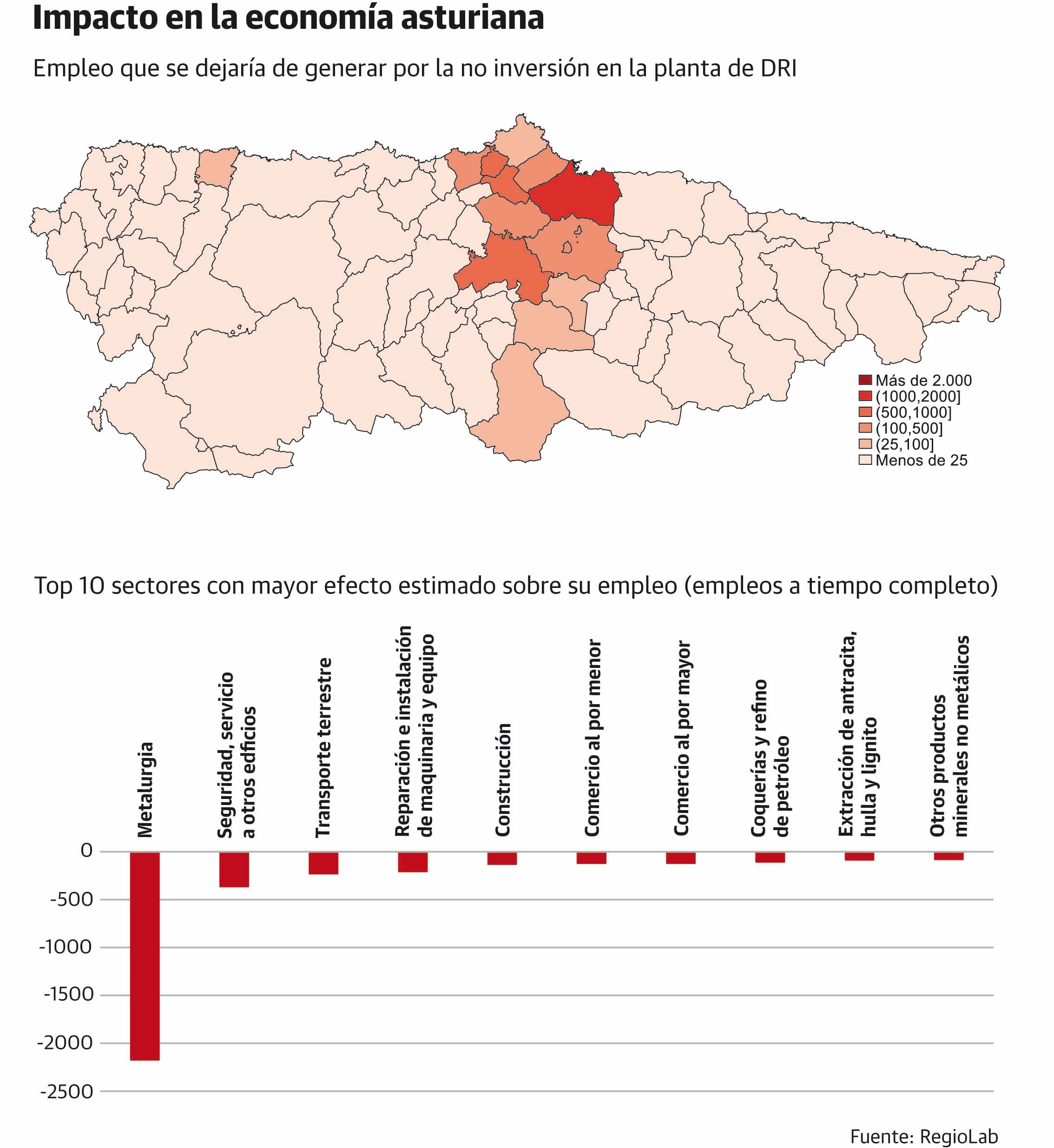 La economía asturiana dejaría de generar «un valor añadido equiparable a más del 1,6% de su Producto Interior Bruto (PIB) y una cantidad ... de empleo de 4.243 puestos de trabajo» sin la planta de reducción directa del mineral de hierro (DRI) de Arcelor. Así lo cuantifica el Laboratorio de Análisis Económico de la Universidad de Oviedo, REGIOLab en el informe publicado hoy sobre el impacto de la decisión de la siderúrgica de paralizar todas las inversiones en instalaciones de este tipo en Europa, incluida la prevista en Gijón.