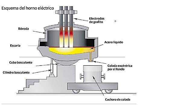 El corazón de la nueva acería será un horno de arco eléctrico, que se ubicará en la actual zona de la nave de cucharas, y que será cargado tanto con chatarra como con hierro de reducción directa, en proporciones diferentes, según el acero que se produzca. Se sustituirá así el arrabio actual, que también se completa con chatarra -alrededor del 15% del total-. Esta instalación contará con una cuba inferior que contendrá el acero líquido con capacidad para 150 toneladas y que estará cubierta por ladrillos refractarios con una vida útil de entre 500 y 600 coladas, por lo que se realizará un cambio de cuba completo cada tres o cuatro semanas.