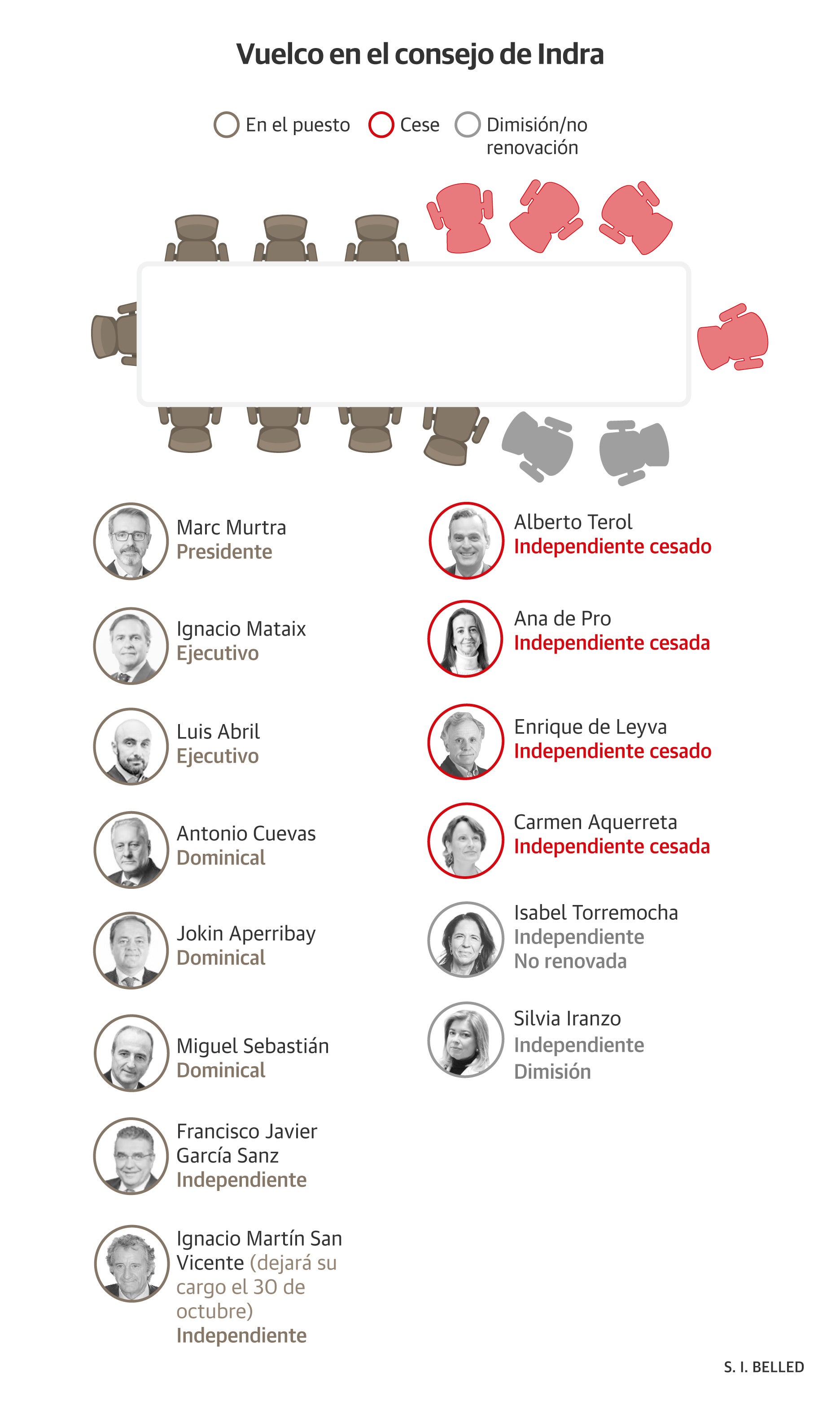 Tras el rosario de salidas de los últimos días, el consejo de Indra ha quedado prácticamente vacío, con tan solo 8 miembros: el presidente del consejo, Marc Murtra; Ignacio Mataix y Luis abril, como ejecutivos; Antonio Cuevas Delgado y Miguel Sebastián, como dominicales y, por último, solo dos independientes, con Francisco Javier García Sanz y Martín San Vicente que, como se ha indicado, dejará su cargo el próximo 30 de octubre.