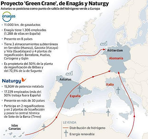 La idea es aprovechar el potencial de España e Italia para generar energía solar y fotovoltaica, producir hidrógeno con ellas y luego exportarlo mediante transporte marítimo y gasoductos a Holanda y Alemania, principalmente, para ser distribuido al resto del continente desde dichos países. Enagás cuenta con la ventaja que supone la regasificadora de El Musel, aunque aún está pendiente de recibir la licencia ambiental que permita su puesta en marcha.