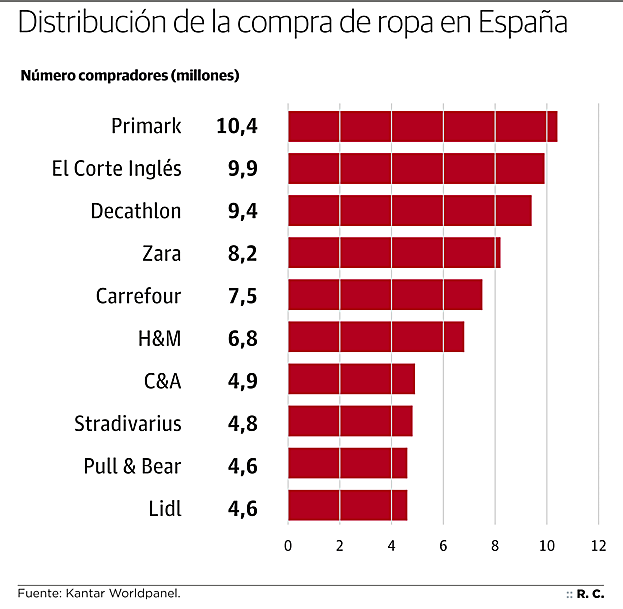 Lejos de la idea que se puede tener de que Inditex copa todo el mercado textil en nuestro país y el poco trozo del pastel que queda se lo reparten entre Mango, H&M y El Corte Inglés, la realidad es otra muy diferente. Según el informe de Kantar, Primark es el líder de la moda, arrebatando la primera posición a El Corte Inglés, después de que la cadena 'low cost' irlandesa cerrara 2018 superando por primera vez la barrera de los 10 millones de clientes.