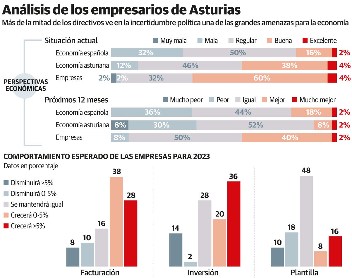 Otro destino prioritario para los fondos europeos es, apuntó Calvo, la retención de talento, que supone el principal problema para cuatro de cada diez empresarios encuestados. Así, instó a adaptar el sistema formativo para equilibrar la oferta y la demanda en el mercado laboral. El tercer ámbito es la simplificación burocrática y administrativa, que reclama el 60% de los empresarios, por lo que los fondos europeos podrían dedicarse a aligerar los procedimientos. «Cautela e incertidumbre» son las palabras que marcarán la hoja de ruta de las empresas asturianas este año, sobre todo por la inflación, los elevados precios de la energía, la escalada de los tipos de interés y la inestabilidad normativa, que «son los elementos que más complican la vida de nuestras empresas». No obstante, los empresarios no se sumen en el pesimismo, «sino todo lo contrario». Así lo demuestra también uno de los datos desglosados por Eduardo González, socio responsable de KPMG en Asturias, sobre el mayor interés de los empresarios asturianos en el acceso a los fondos Next Generation: el 34% frente al 27% nacional. Otro aspecto curioso es que, aunque perciben la situación general como desfavorable, lo cierto es que el 24% tiene previsto hacer adquisiciones este año y el 10% ya las ha realizado.