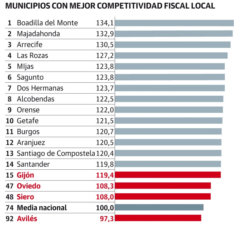 Su informe 'La competitividad fiscal de las entidades locales y de las comunidades autónomas' sitúa a los consistorios asturianos un 9,2% por encima de la media nacional en ese desempeño, solo por detrás de los de Baleares, Madrid y Cantabria. Pero la situación no es homogénea. Entre ellos, destaca la posición de Gijón, décimo quinto entre los 141 municipios con más de 50.000 habitantes analizados, con una puntuación un 19,4% superior al promedio. Oviedo, por su parte, está en el puesto número 47 de la lista (+8,3%), Siero en el 48 (+8%) y Avilés cae más atrás, hasta el 92 (-2,7%). Los municipios que encabezan la clasificación son Boadilla del Monte, Majadahonda, Arrecife y Las Rozas, mientras que Reus, Girona y Sanlúcar de Barrameda, la cierran.